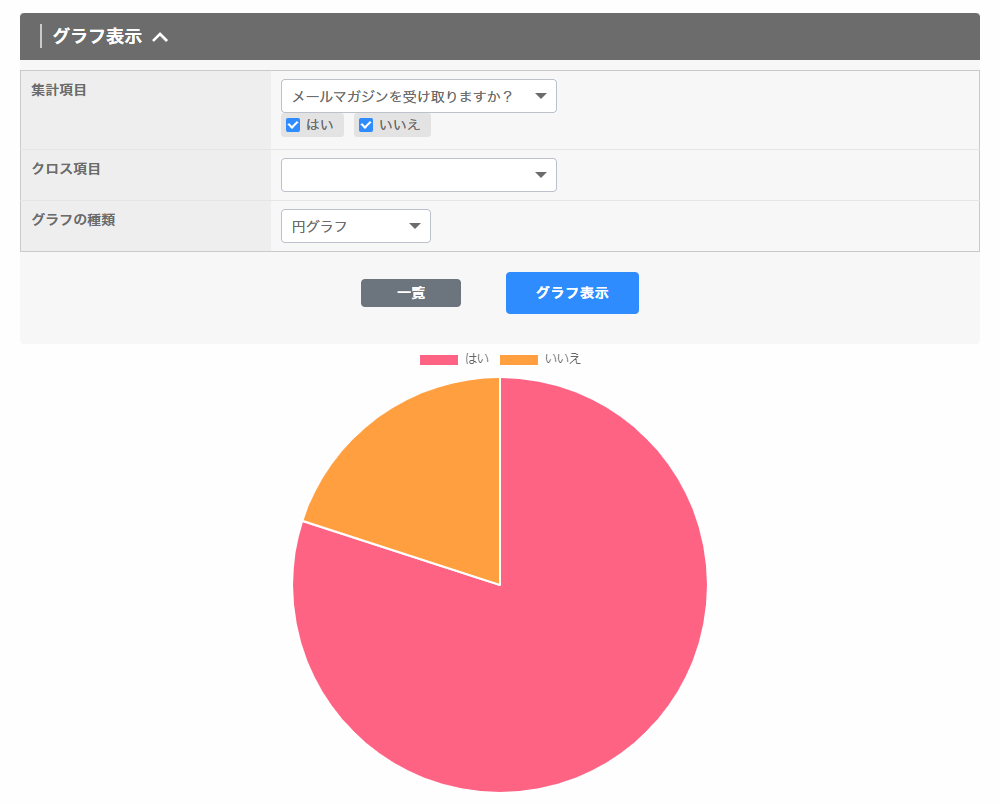 IQ-FORMで作成したアンケートフォームに登録されたデータは、即時フォームごとにデータベース化され、管理画面でさまざまなデータオペレーションが可能になります。 単純にCSV出力するのはもちろん、グラフ表示も随時可能で、そのまま分析できます。 アンケートのフォーム自体の作成数に制限はありませんので、複数のアンケートを同時に実施可能です。 |