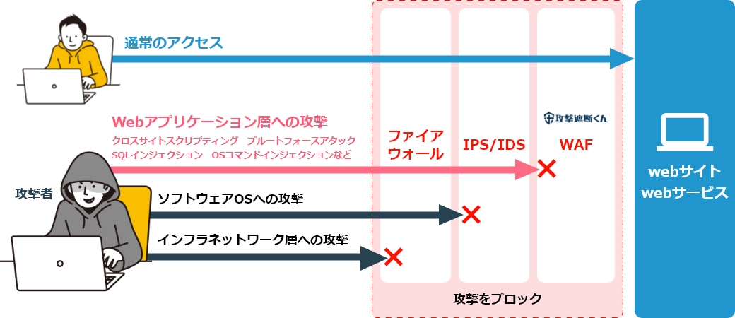 WAFは、従来のFW(ファイアウォール)やIDS/IPSでは防ぐ事ができない攻撃にも対応します。