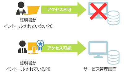 クライアント証明書とは、個人や組織を認証し発行される電子証明書です。クライアント証明書がインストールされたPCを利用することで、個人情報を含む機密情報が格納されたサービス管理画面へのアクセス制限が可能になります。