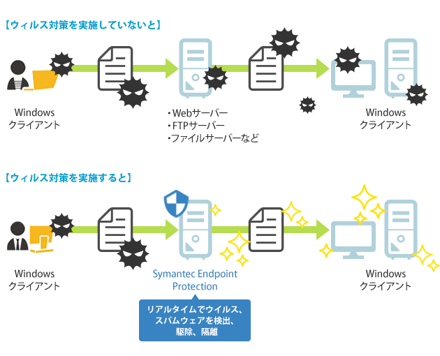 弊社では、「世界NO.1シェアの軽い・早い、防御力NO.1のエンドポイントセキュリティソフト」として、サーバ上のウイルスチェック機能を持っており、リアルタイムスキャンやパターンファイル自動更新をおこなうことができる「Symantec Endpoint Protection」をご提供いたします。