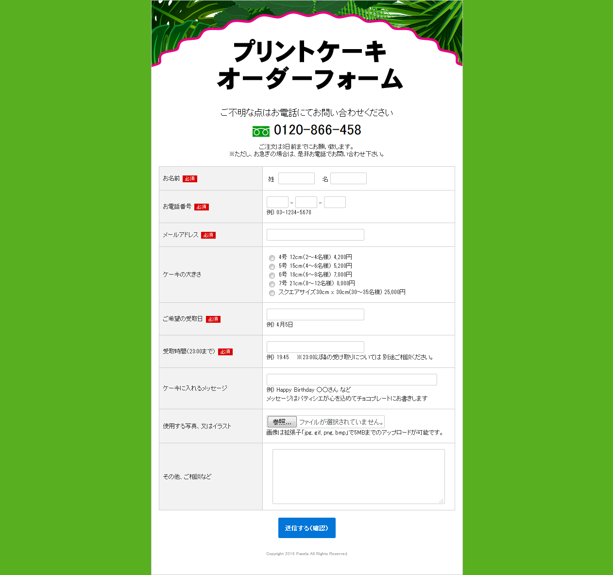 また、専属パティシエが作るアニバーサリーケーキのオーダーサービスでは、好みの写真を入れられる「プリントケーキ」のオプションサービスを提供しており、プリントする写真のアップロード機能付きの注文フォームを作成しています。